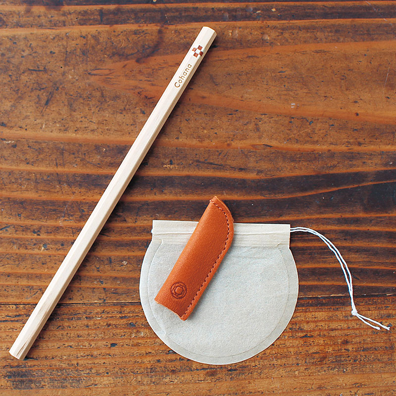 本体=木(桂・水木・唐変木)、粘土、黒鉛、油、キャップ=本革、袋=トウモロコシ繊維、ナイロン