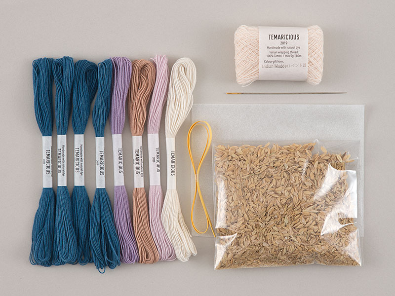草木染刺しゅう糸、手まり土台用糸、籾殻、薄紙、紙テープ、針