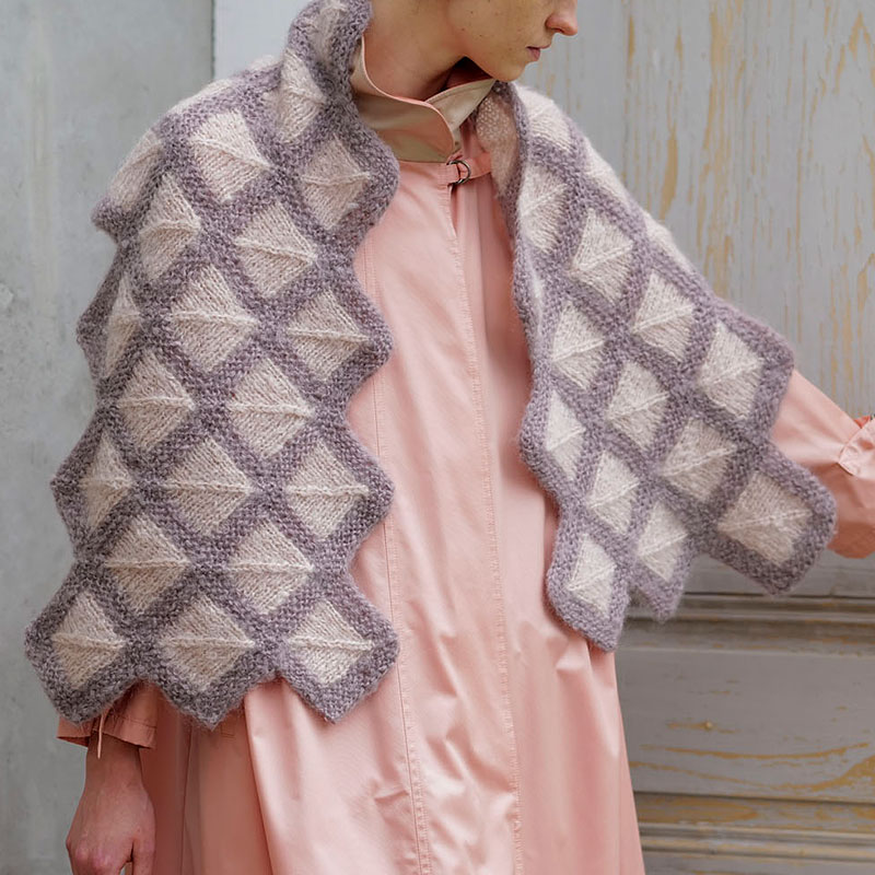 中上3目一度のラインが中央に走る、リーフのような模様が並ぶドミノ編み。バスケット編みと同じように、四角いモチーフをつないでいきます。配色があるので編み地の進み方がよく分かる、このショールではじめの一歩を。