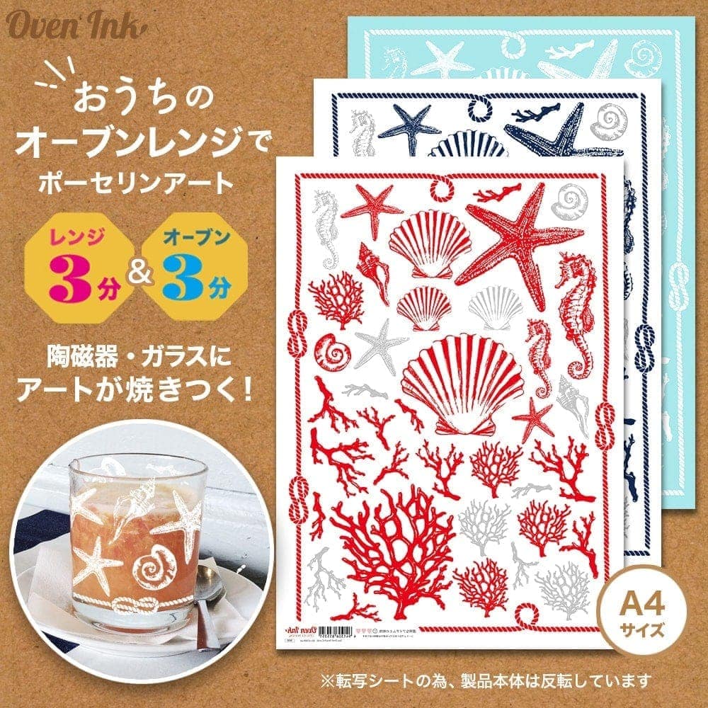 オーブンインクは、陶器やガラスに家庭用の電子レンジ3分&オーブン3分でシートの絵柄だけが焼きつく新感覚のクラフトです。シール感覚でオリジナル柄の雑貨や食器づくりが楽しめます。