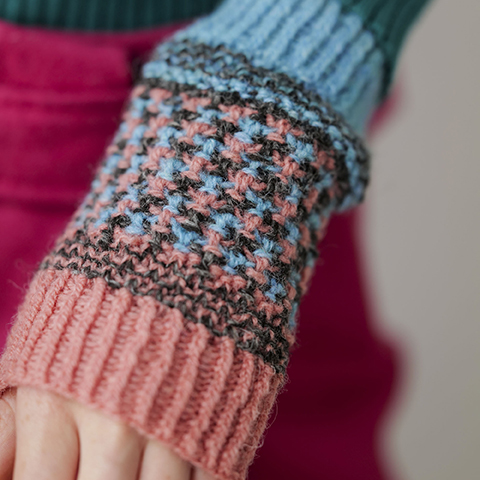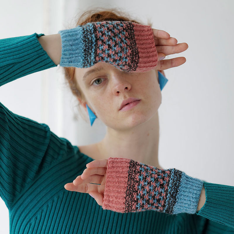 シンプルな筒状なので、輪編みはじめてさんにもおすすめの作品。左右で「up side down」、上下を入れ替えて使うのも面白い。