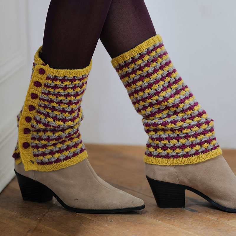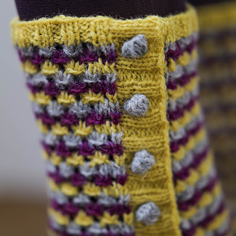 材料:ジェイミソンズ シェットランド・スピンドリフト 黄(Daffodil 390)35g/2 玉。薄グレー(Sholmit/Mooskit 119)・ ワイン色(Mantilla 517) 各20g/各1玉。