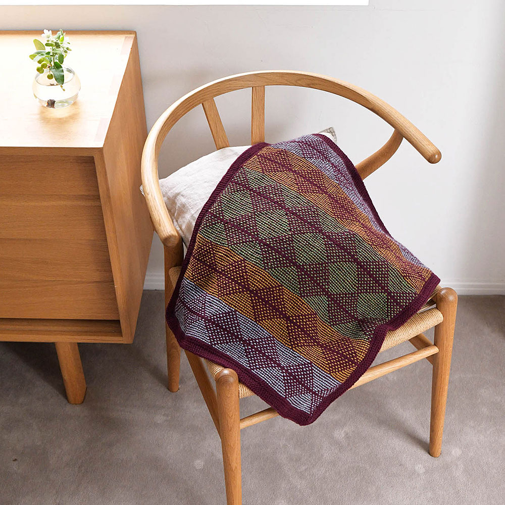 ガーター編みとすべり目を組み合わせて模様を作る「モザイクニット」の応用編。縁編みにもちょっと面白い仕掛けがあります。 色を選ぶ時にはコントラストが大事。そして色が決まったら今度は、どの色を表から見たときの裏編みの段にしたら素敵になるか、試し編みをしてください。