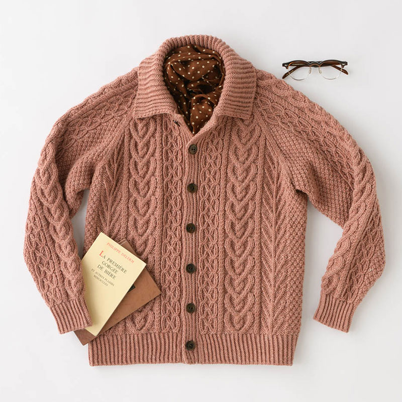 アラン風交差模様をたくさん配した、編みごたえのあるジャケットです。普段は滅多に着ないのですが、今回はスモーキーなピンク色をチョイスし、また、メインにハートのような模様を配置し、ちょっと遊んでみました。縁編み・衿はねじり1目ゴム編みにして、厚みを持たせ、締まりのあるようにしました。ラグランスリーブは着やすく動きやすいのが気に入っています。