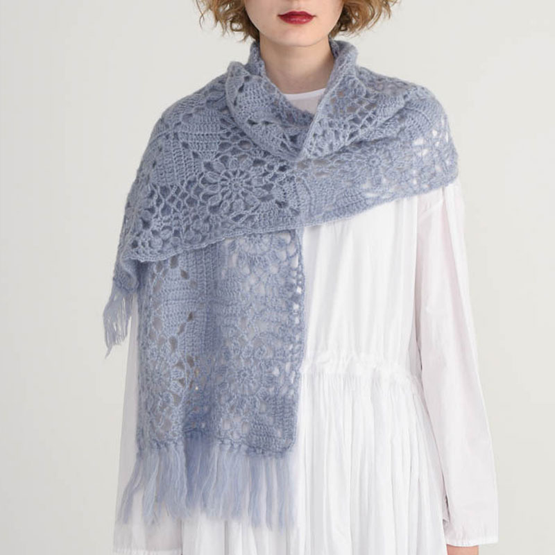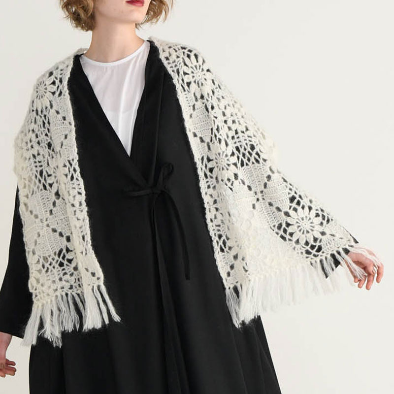 ひとつの四角いモチーフを2列につないだバージョン。モチーフを4枚合わせると、対角に配した模様がつながって新たな模様が見えてきます。どんなコーディネートにも合わせやすく、それでいて華のあるホワイトをチョイスして。