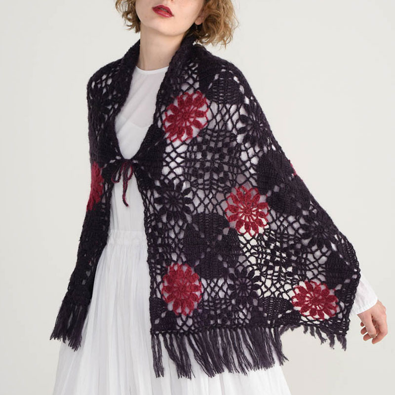 ひとつの四角いモチーフの色をつないでいるのに、3列バージョンは、がらりと表情が変わります。1枚置きに配色した中央部分がこぼれ落ちる花のようで雅やか。色 だけでなく、糸の質感をかえて組み合わせるのも面白いかも知れません。