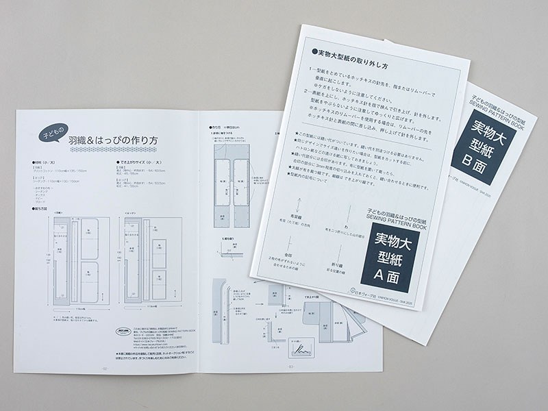 子ども用の羽織とはっぴが作れる型紙BOOK。未就学児・小学校低学年向けの2サイズを掲載。面倒な型紙準備の工程が省け、すぐに布の裁断にとりかかれるのでとっても便利! 学芸会、お祭り、ハロウィンのコスプレなどにもおすすめの1冊です。