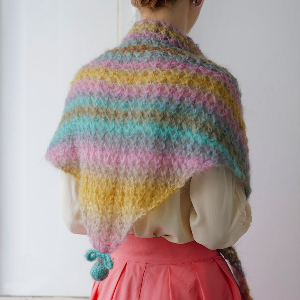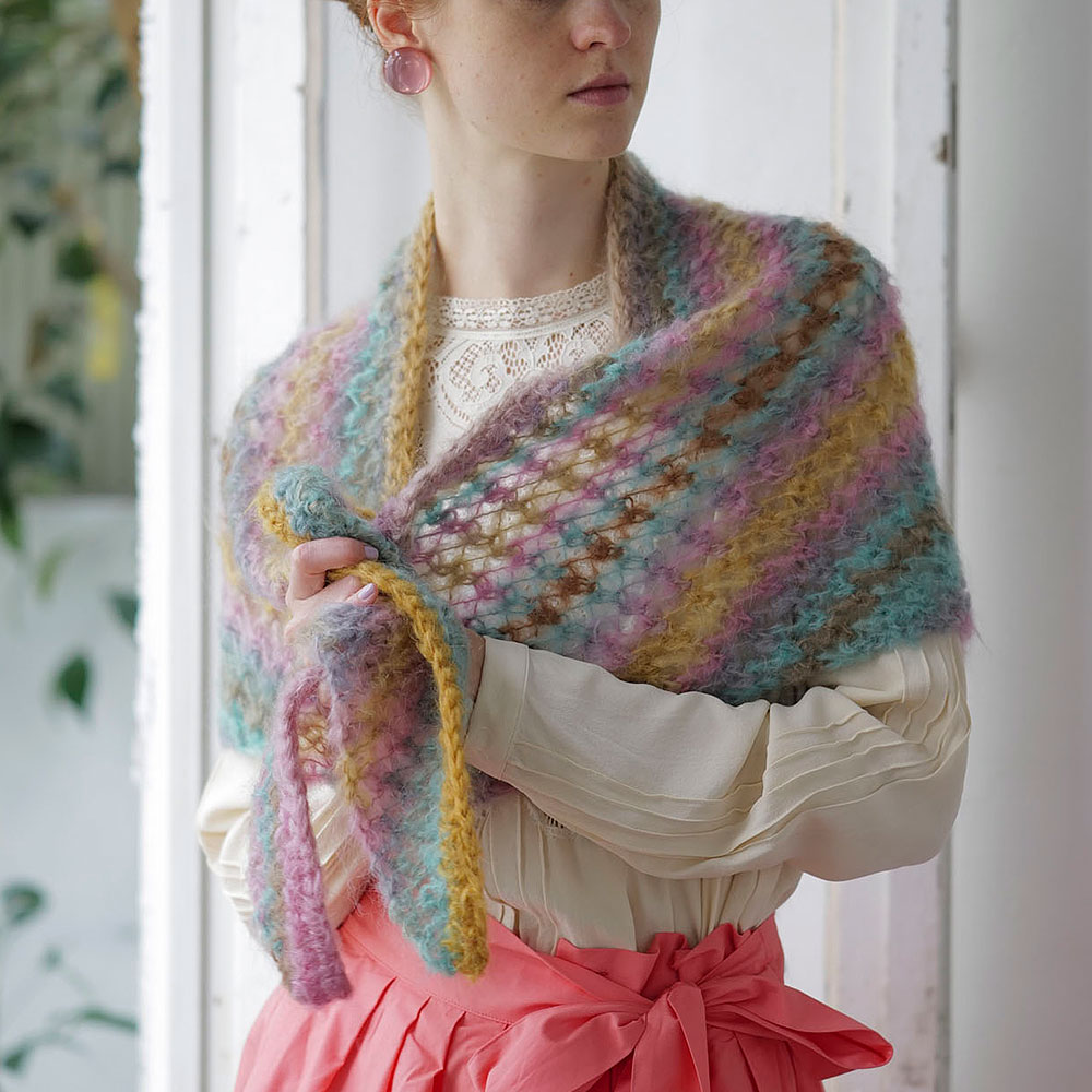 透かしの大きな編み地は、魔法の一本針の得意技。 針についたコードに編み目を通していくので、幅広の編み地も輪針のように編めます。カラフルな段染めモヘアで、軽やかなショールに仕上げましょう。<編み方プロセスつき>