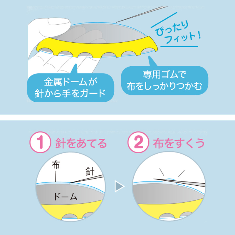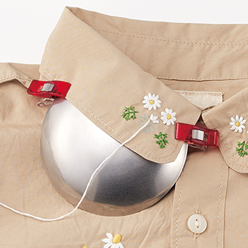 刺しゅう枠だと張りにくい、洋服の襟・ポケット・腕部分、ズボン、ポーチなどへのステッチが楽にできる便利なアイテム。ドームに針をあて、布をすくうことで、楽にステッチができます。