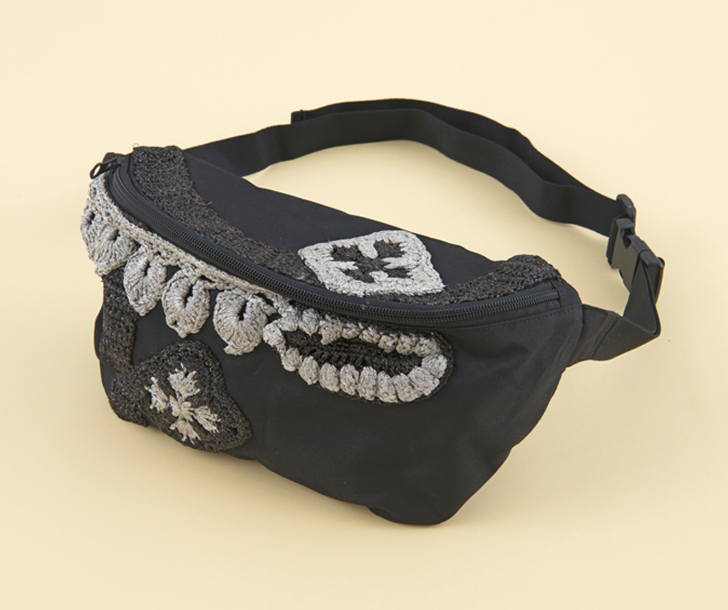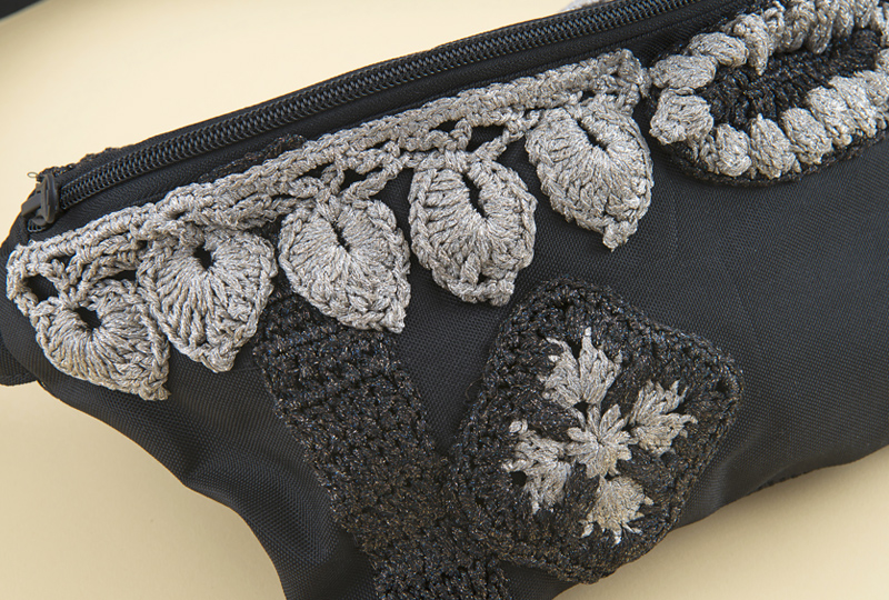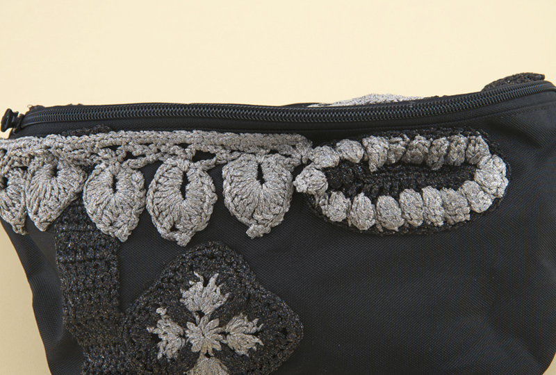 【キット作り方つき】「エクトリー・ファッション専科」講座で使用した材料セットに作り方をつけたキットです。ラメの折り込まれた糸で、4種類の立体モチーフを編み、完成済みのボディバッグにつけて装飾します。