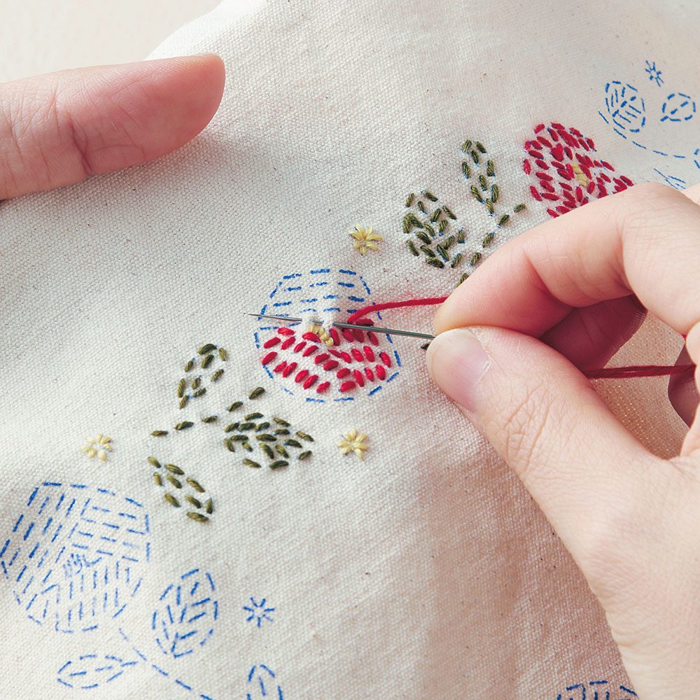 布地にはあらかじめ図案がプリントされているので、刺し子の模様をなぞるように刺していくだけで、完成度の高いバッグが出来上がります。