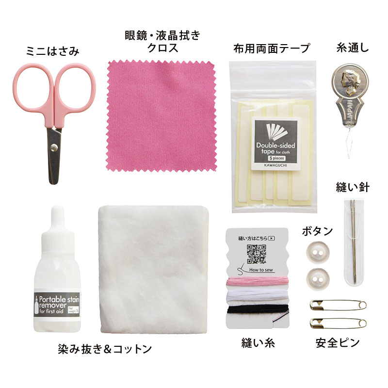 縫い針、縫い糸、糸通し、ボタン、安全ピン、ミニはさみ、染み抜き&コットン、布用両面テープ、メガネ・スマホふきクロス 計9点
