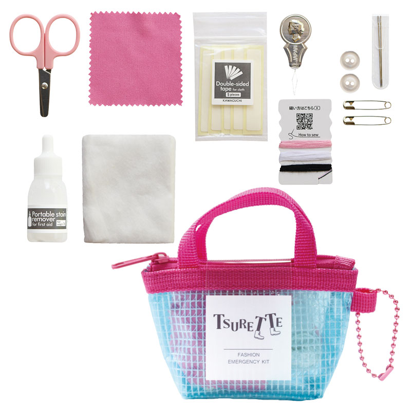 縫ったり貼ったり汚れを落としたり、外出時の洋服のトラブルに対応できるお助けセットです。バッグなどにつけられるストラップつき。