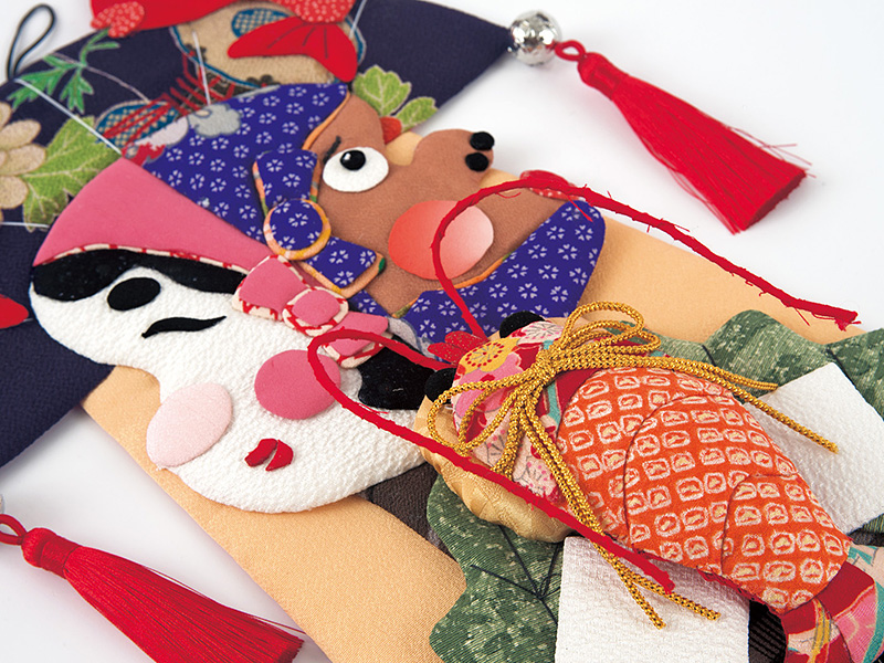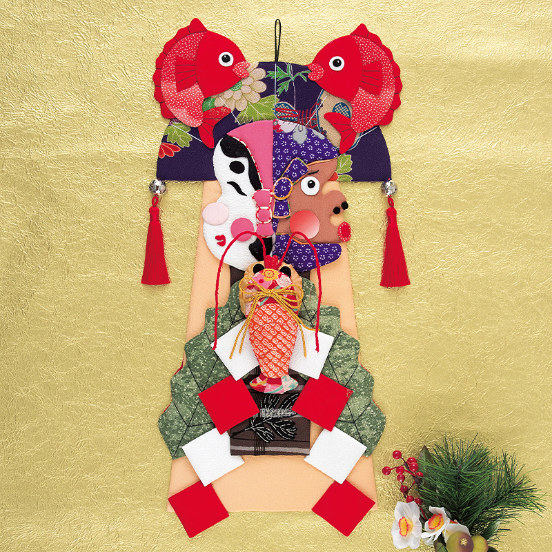 【古裂】【キット作り方つき】福の象徴・おかめとひょっとこに、鯛や伊勢エビを合わせました。縁起のいいモチーフを盛り込んだ押し絵のしめ飾りです。