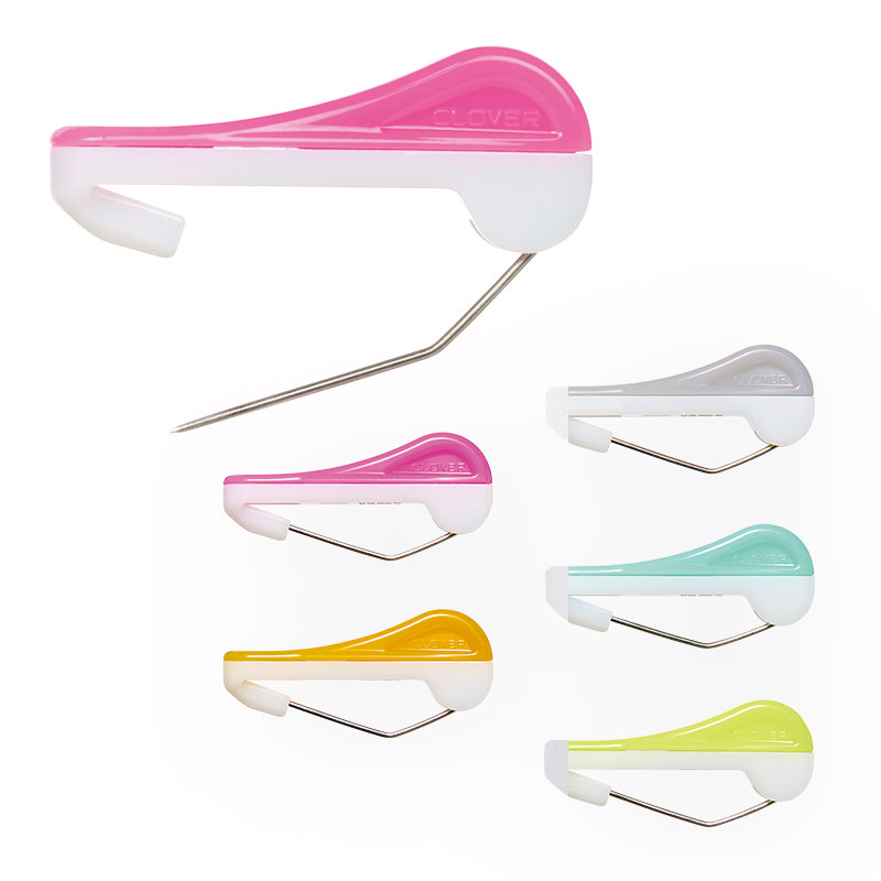 生地がすくいやすい、ピン部分が曲がった形状のしつけピン。押すだけで針を開閉できるので、指を痛めることなくスピーディーに作業できます。キルティングやミ