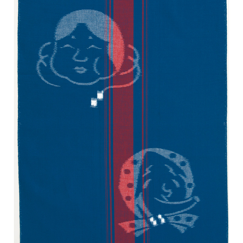 くくり染めした、たて糸とよこ糸を合わせた、複雑な柄の美しさが特徴の 久留米絣。中でも伝統とモダンの融合が特徴の坂田織物から、おめ でたいおかめひょっとこ柄をご用意しました。