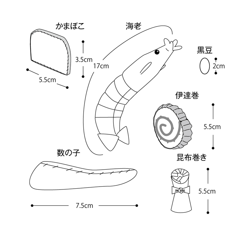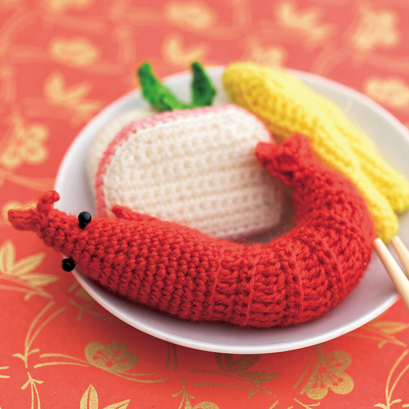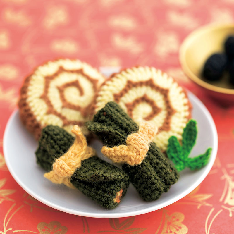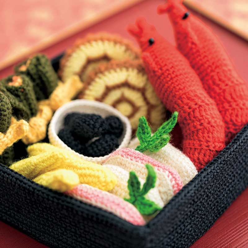 まずは重箱を用意して、続いておせちを編みましょう。 黒豆を盛った器も編んでいるし、海老の眼はパールビーズを付けて飛び出させる芸の細かさ!伊達巻のステッチは見事で思わずかじりつきたくなってしまうできばえです。