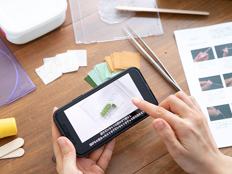 このキットでは「台張り」「刺し始めの玉結び」「針止めと肉入れ」の3動画がご覧いただけます。※写真は同シリーズ「つまみ細工」動画のイメージです。