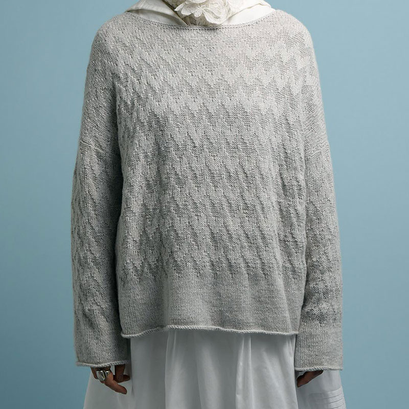 スムースで滑らかなメリヤス編みの表目面と、少しざらついた雰囲気の裏目の面。 交互に編んで、ジグザク模様を作りました。ロイヤルベビーアルパカ&ウールシル クで2本どりした素材の柔らかな質感も素敵です。
