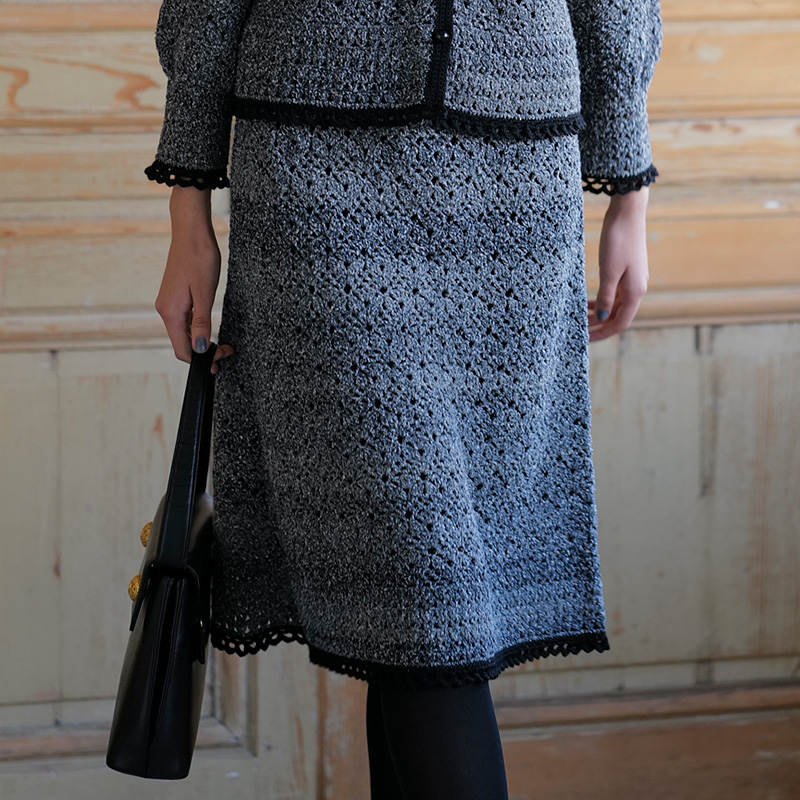 機械では編めない、ひとの手が編み出す唯一無二の存在感が魅力のかぎ針編み。フェミニンで可愛らしいツーピースは、クールな透け感やレーシーな裾の手仕事がとっておき!手編みの醍醐味を満喫してください。(※こちらは、スカートのみのレシピです)