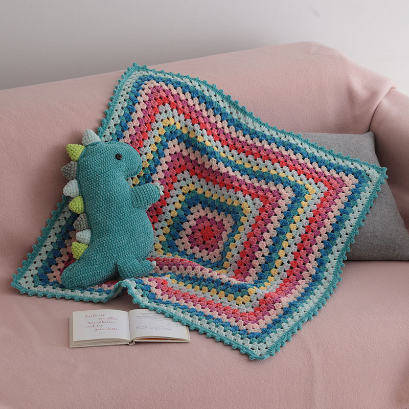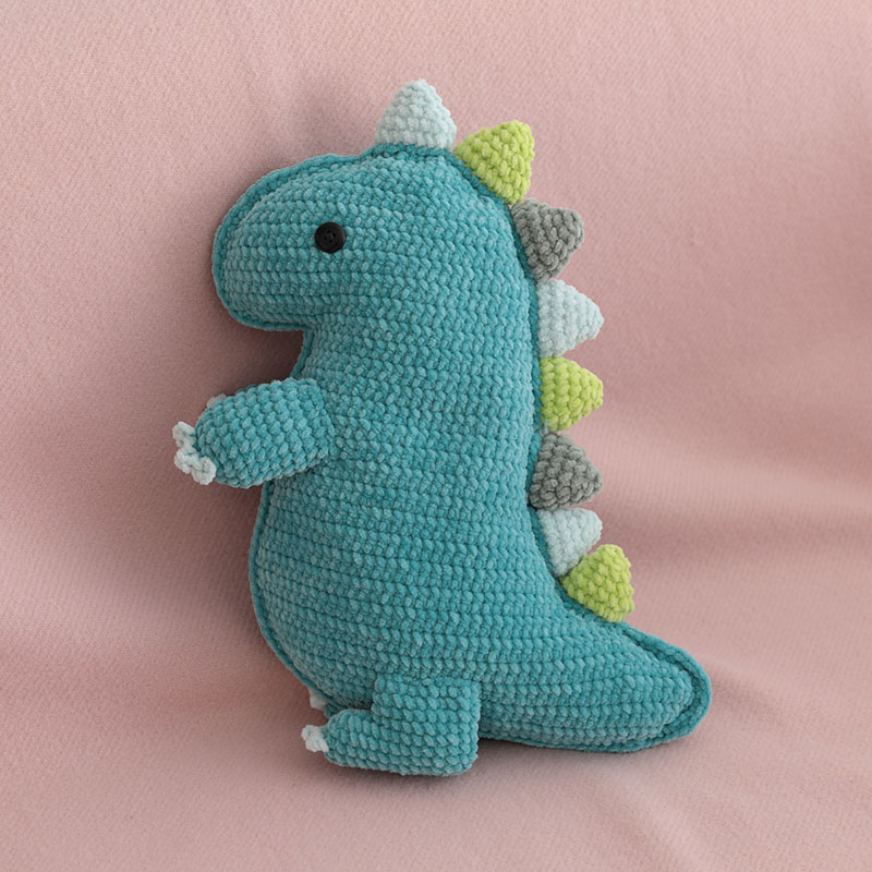 シェニールヤーンのふわもこの肌触りが、もう最高! 恐竜形のお昼寝クッションとミ ニブランケットのセットは、子供にも大人にも大人気の嬉しい贈り物です。