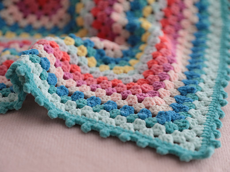 材料:[ブランケット] DMC ハッピーシェニール 青緑(030SURF’S UP)45g/3 玉、薄緑(016 MARMAID)40g/3 玉、青(026 SPLASH)30g/2 玉、ベージュ(010FROTHY)・薄ピンク(015 CHEEKY)・赤紫(024PARTY)・ピンク(013 FUZZY)・朱色(032 TUTTIFRUTTI)各20g/各2 玉、薄グレー(011 FLUFFY)・黄(014 DUCKLING)各15g/各1玉。[クッション] DMC ハッピーシェニール 青緑(030 SURF’S UP)90g/6 玉、黄緑(029 FIZZY)10g/1玉、薄緑(016 MARMAID)・灰味緑(023 MOSSY)各5g/各1玉。直径15mm のボタン2 個。手芸綿 適宜。