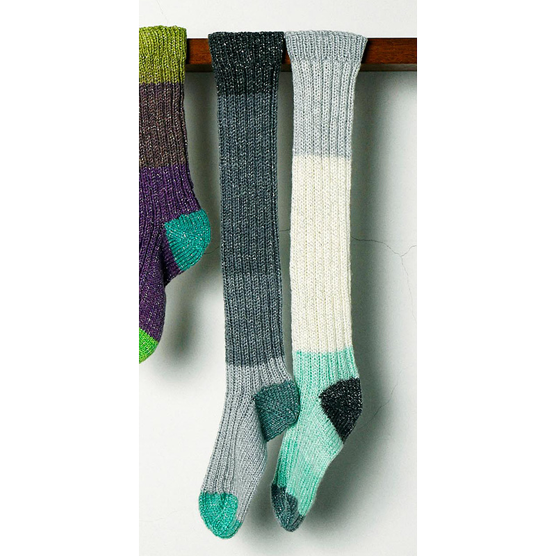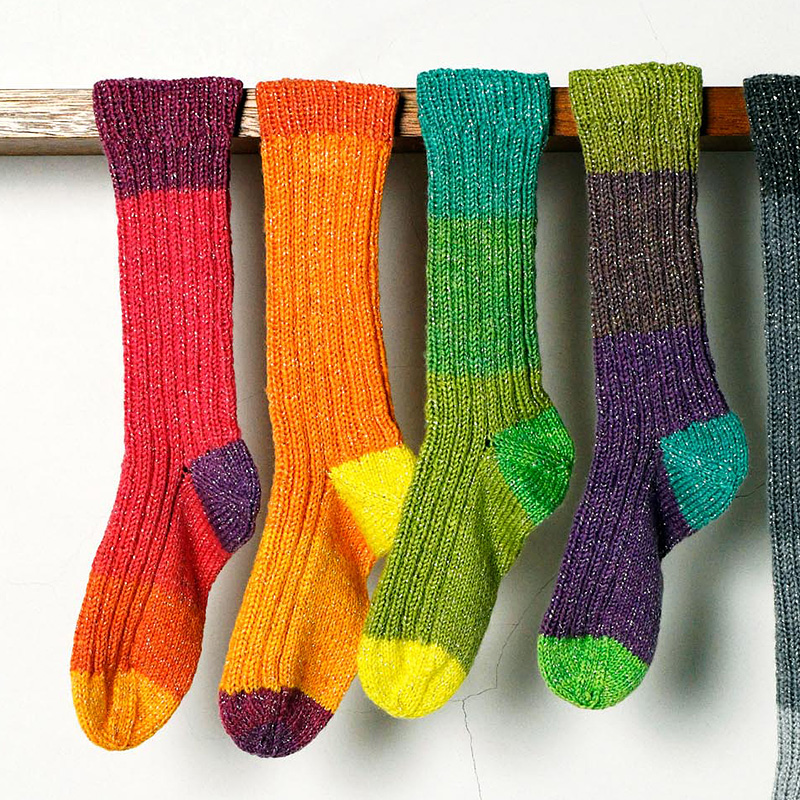 かと&つま先をパキッと色にするコツは、遠くにある色を選ぶこと。本体を編み終えたら別の本体にかかとやつま先を編むのがベスト。良く良