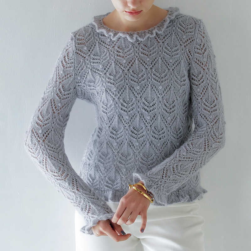 「クチュールニット8」の淡いピンクのプルオーバーを、薄めのグレーでレースのフリルをつけた、華やかな大人のプルオーバーにアレンジ。クチュールアレンジでは初めての毎段模様ですが、編み図の見方のコツさえつかめばそんなに難しくありません。ぜひチャレンジしていただけると嬉しいです。