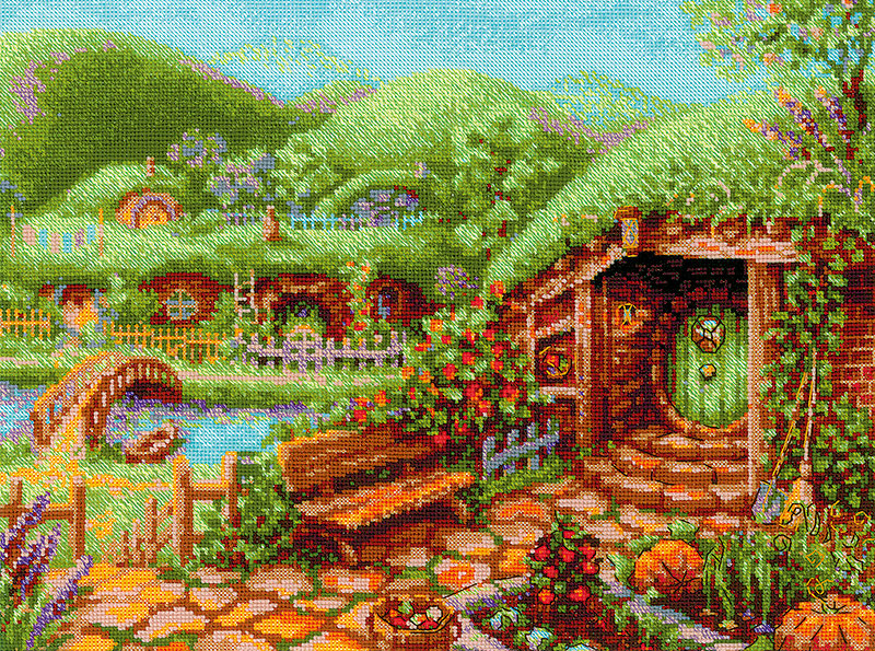 緑の丘の小さな家。おとぎ話に出てきそうな風景を描いたクロスステッチ作品です。極細毛糸で刺すのでふっくらと仕上がります。中級の方へ。