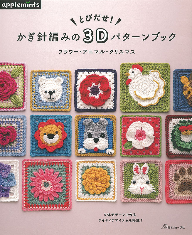 かぎ針で編む立体的な(3D)モチーフばかりを集めたパターン集。サイズは10cmと12cmの正方形で展開。「お花」「アニマル」「クリスマス」と幅広いテーマで展開。また、パターンを使用したバッグやポーチなど実用的な使用例アイテムも掲載。
