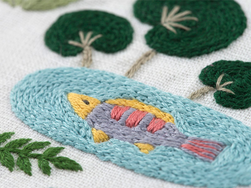 先に魚を刺してから、池の水をチェーンステッチで埋めるように刺していきます。