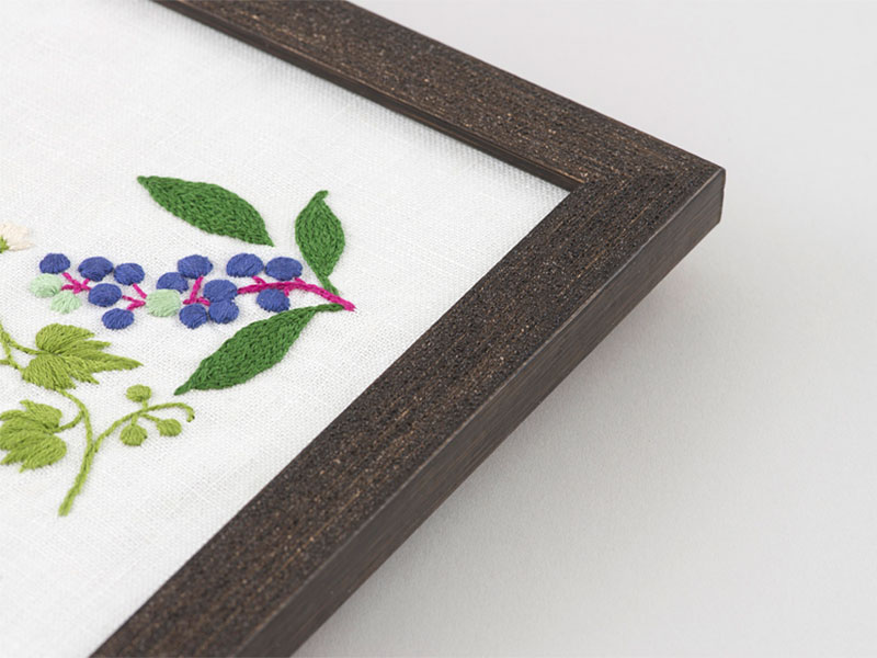 質感のある特徴的な額を使用しています。長く飾ったり、ほこりがつかないようにしたい場合は、ガラスを刺しゅうの上に重ねて使ってください。