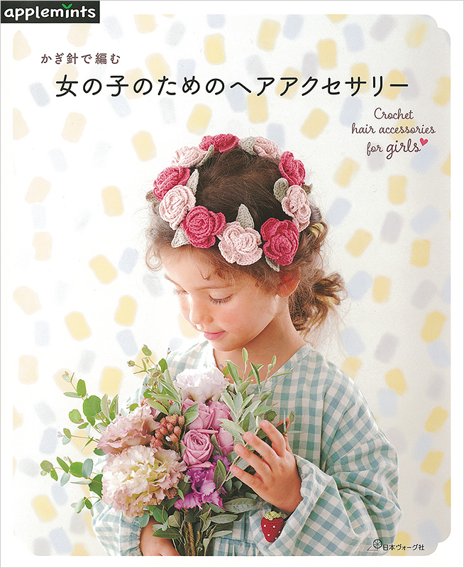 6歳くらいまでの女の子へ向けたヘアアクセサリーの作品集。アイテムは、カチューシャ、ヘアバンド、花冠、バレッタ、ヘアピン、ヘアゴムを掲載。子供の肌に触れても安心なコットンの糸を使用し、お菓子、果物、花、動物のモチーフやハロウィンやクリスマスなどの季節のイベントのモチーフまで紹介。