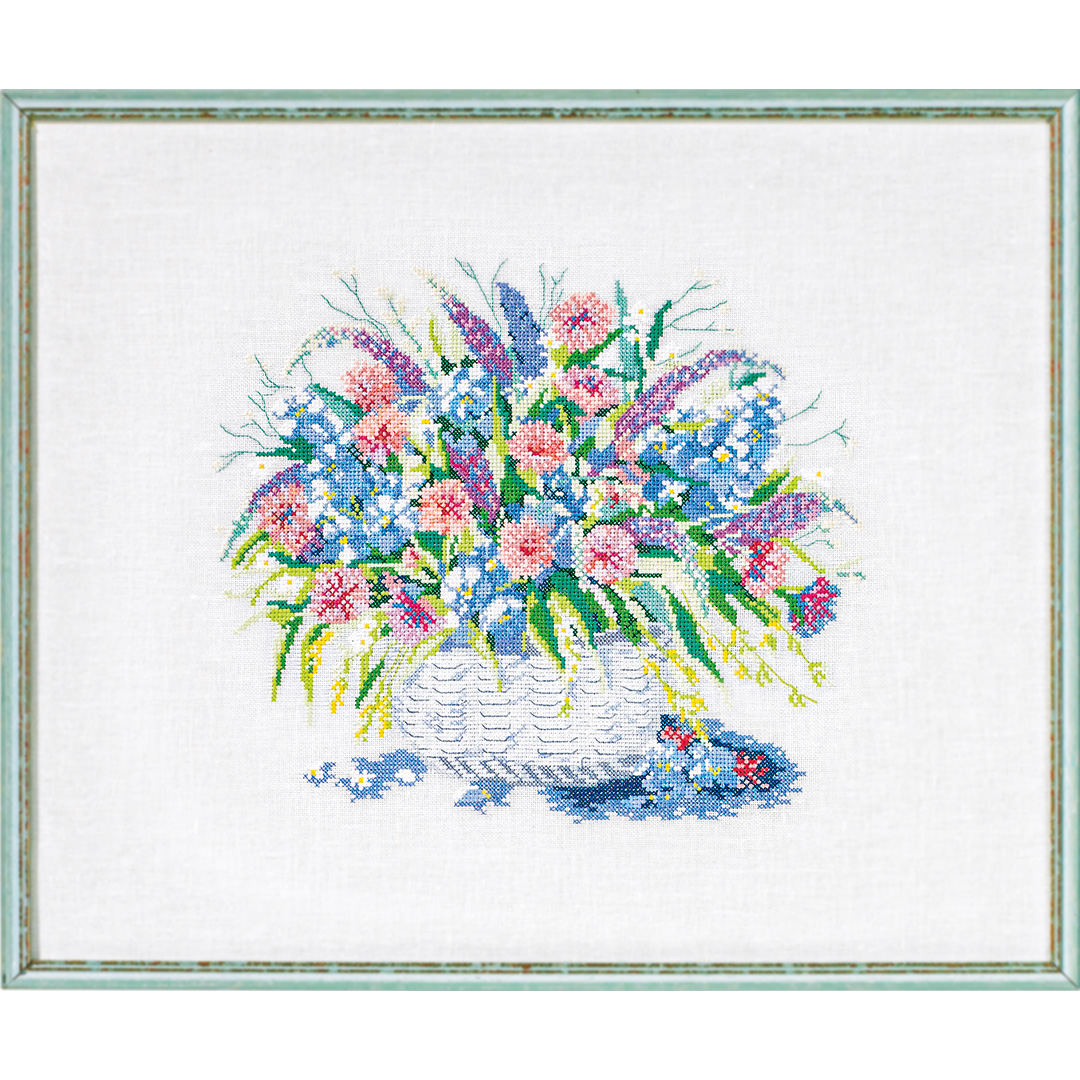 ピンクやパープル・ブルーの花々が可憐な花々が溢れる、フラワーバスケットを描いたクロスステッチ作品です。中~上級の方向き。デンマーク・Permin社製。