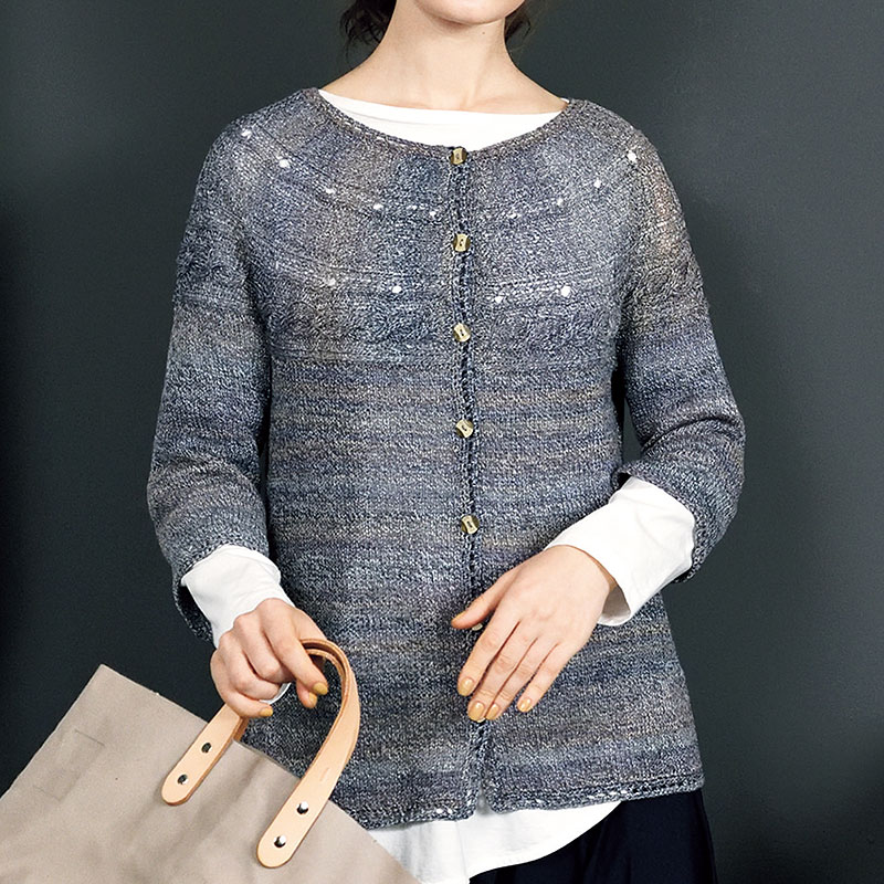 横編みにしたヨークから身頃を編み出す、ひねりのあるトップダウン。シックな段染め糸で丈も長めに。ヨークと身頃で段染めの出方が変わり、さりげないニュアンスを添えてくれます。