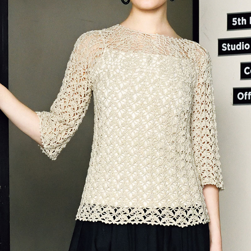 かぎ針で編むトップダウン。小さな葉っぱを連ねたような模様で、美しく可憐に。細めの糸で、体にフィットするプルオーバーに。シルクヤーンで編んだら、ちょっと畏まったおでかけにも着られる特別な1枚になります。しっかりとした袖も、トップダウンならシームレスに編めますね。