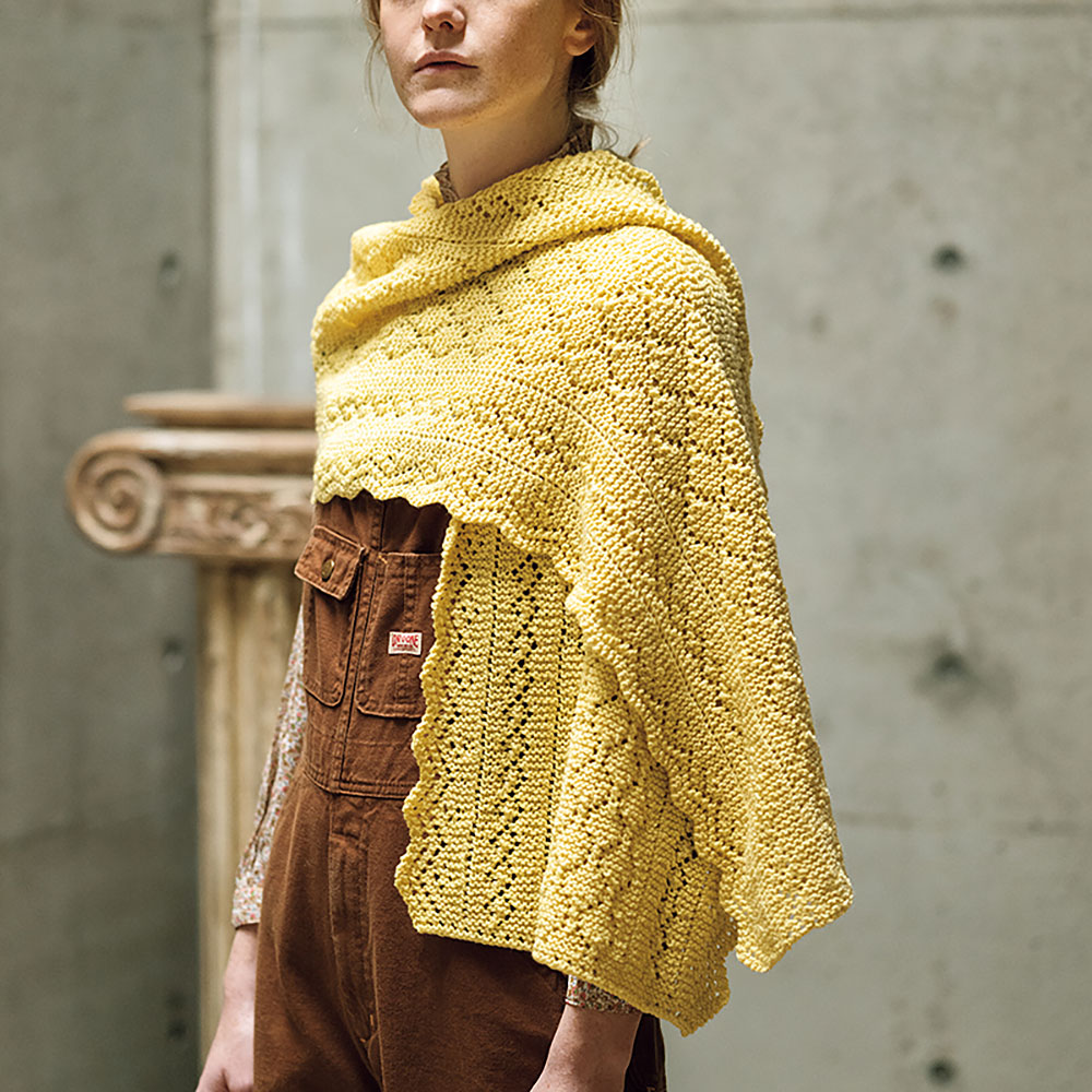 春を告げる花、ミモザ色のショールは、巻きや すい幅広の長方形スタイル。なかなか進まない ガーター編みベースですが、透かしの操作は表 を編むときのみなので、迷うことなく編めるは ず。シェットランドレースのような縁が可愛らし いデザインです。