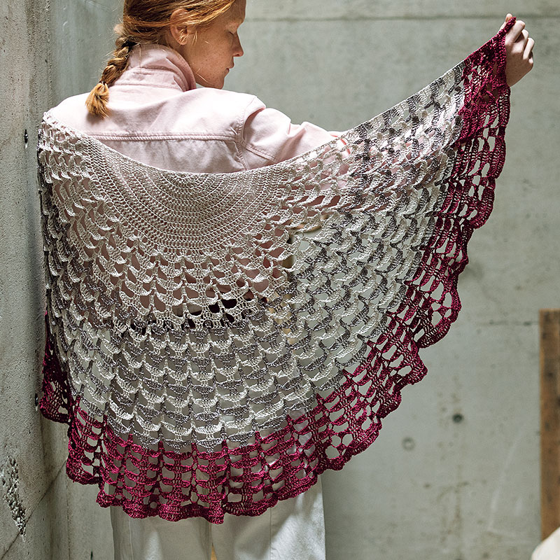 肩のラインに無理なく寄り添う、クレッセントスタイル。羽織りやすく、肩から落ちづらいので、使い勝手の良い形です。鳥が飛んでいくようにも見える大きな透かし柄が弧を描き、3つの色が集まり、離れて、美しく広がります。