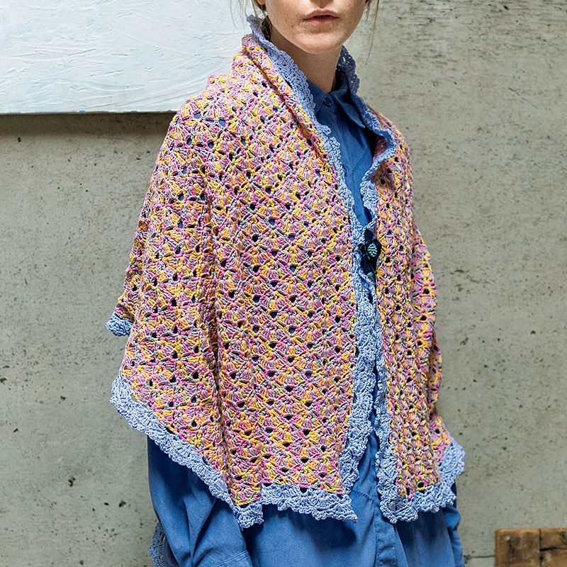 たっぷりとした質感が魅力の大判スタイル。か ぎ針編みとグラデーションヤーンの組み合わせ は、色の出方に意外性があり、いつもの扇模様 も違った表情が楽しめます。マルチカラーの本 体をキリッと締めた単色のトリミングがクール。