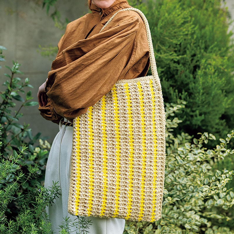 プレーンアフガン編みに、長編みの2目一度や裏目、そしてすべり目を組み合わせた模様でスキルアップ! 軽快なカラーリングは横編みにして縦ストライプに。とても軽い素材を使った、機能的なバッグです。