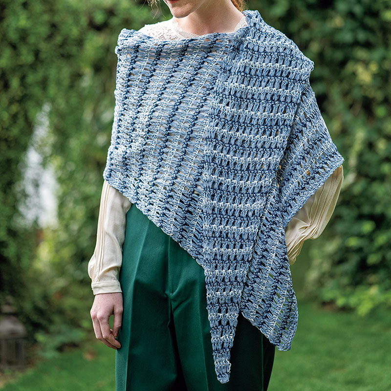 細長いタイプのストールは、巻きやすいので1枚あると便利です。往路と復路のセットが1段になるアフガン編み。もどり目で色を変えミックス感のある縞にし、チェーンペトゥール編みを入れて春らしい透け感を作ります。