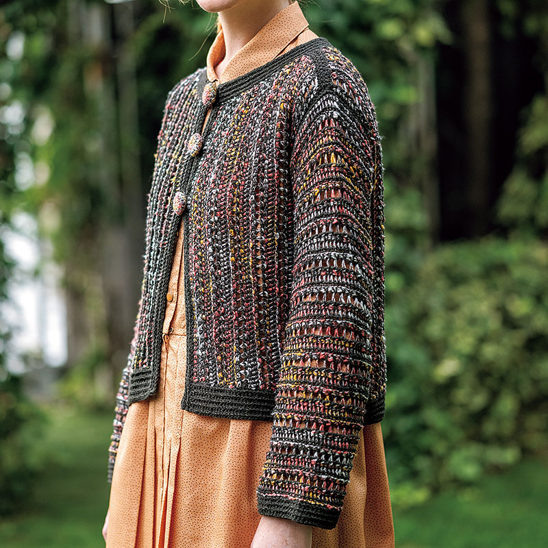基本的にまっすぐ編み進むので、アフガン編みの初めてウエアにおすすめです。段染め糸の多色の中からメイン色を選び、とじはぎの位置にもアクセントとして使うことで全体をまとめています。
