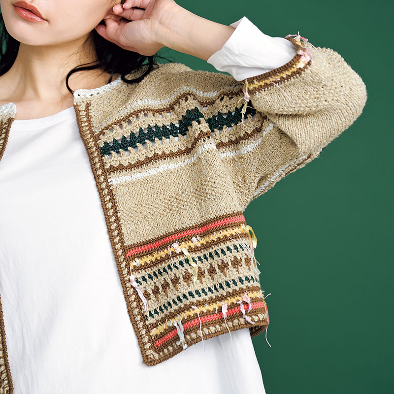 ベージュのオーツに、いろいろな糸をトッピング。棒針 とかぎ針もミックスして、楽しいジャケットに仕上げました。丈は短くして軽やかに。
