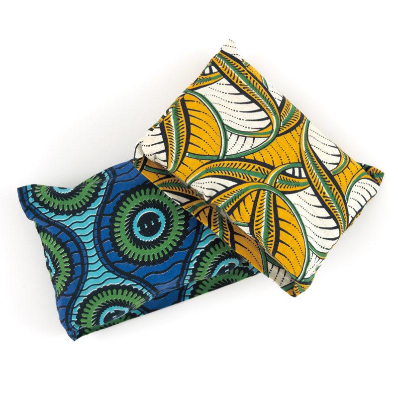 【完成品】東アフリカの伝統的な「キテンゲ布」をイメージした柄のエコバッグ。結ぶ位置でショルダーの長さが変えられ、マチが広くたっぷり大容量の便利アイテムです。