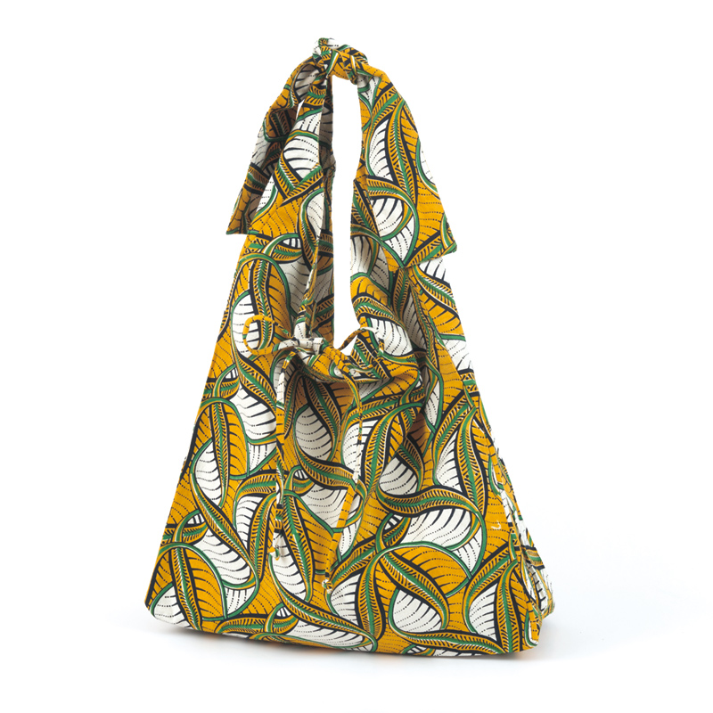 【完成品】東アフリカの伝統的な「キテンゲ布」をイメージした柄のエコバッグ。結ぶ位置でショルダーの長さが変えられ、マチが広くたっぷり大容量の便利アイテムです。