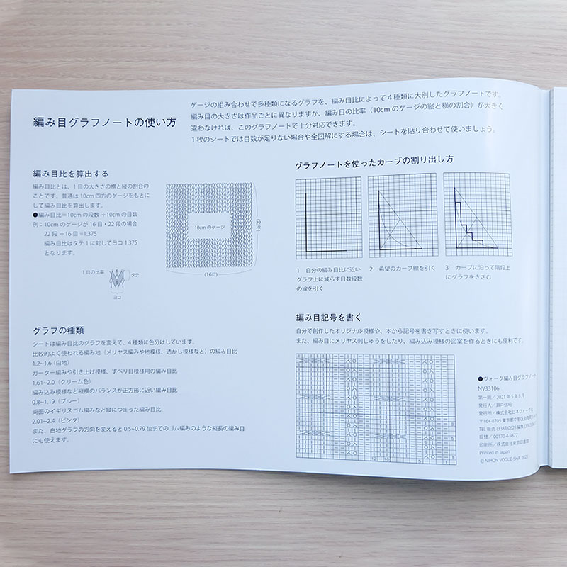 模様編み記号図を書くために使うグラフノート。カーブの割り出しをするためにも使えます。縦横の比率の違う3枚の用紙、編みたい編み地により近い形で割り出しをすることができます。