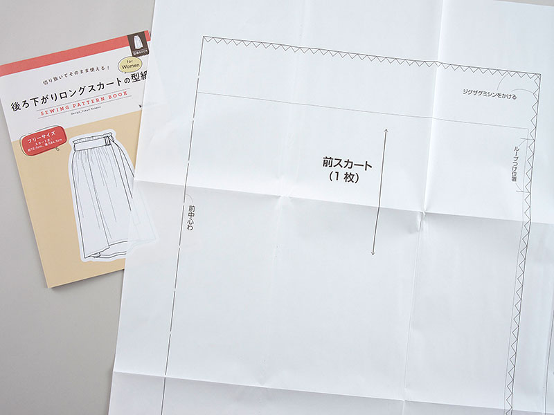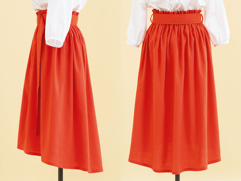 前から後ろに向けて、緩やかに丈を長くしてある、おしゃれ度の高いスカート。ギャザーたっぷりでも、大人が格好良くはきこなせるデザインです。柔らかい生地を選ぶと、ギャザーがきれいに出ます。