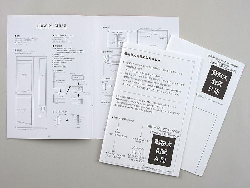作り方はイラストで丁寧に解説。実物大型紙は2枚ついています。