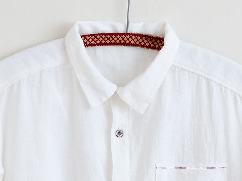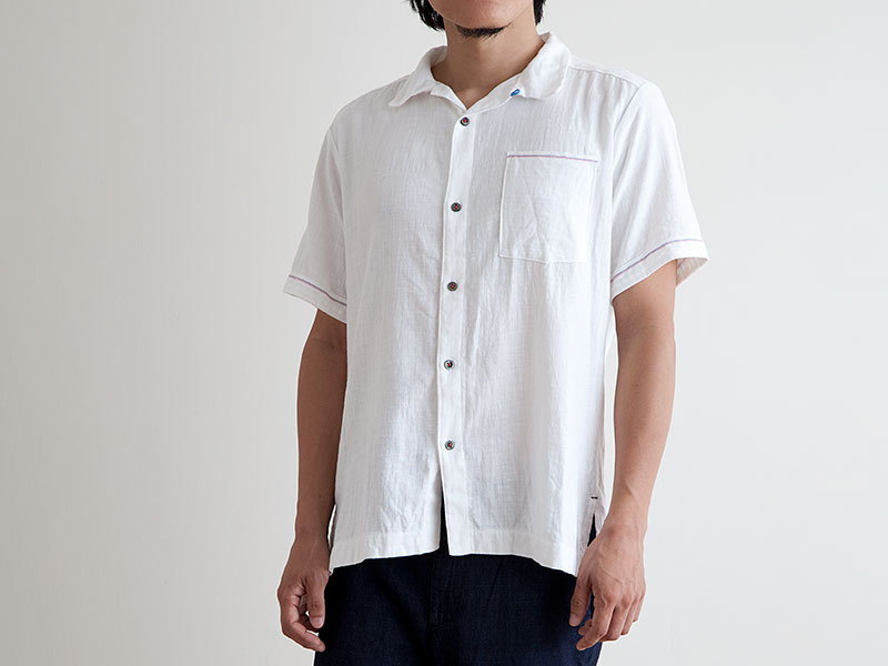 着やすくて涼しい、半袖の開襟シャツ。シンプルなリネンを使い、ポケット口や袖口にリネン布の耳の織りラインを利用してアクセントにしました。柄生地でアロハシャツ風に作っても。メンズ仕様ですが、女性がオーバーサイズぎみに着るのも素敵です。