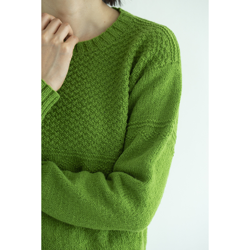 胸から上にはジグザグとモスステッチ(かのこ編み)を配しました。